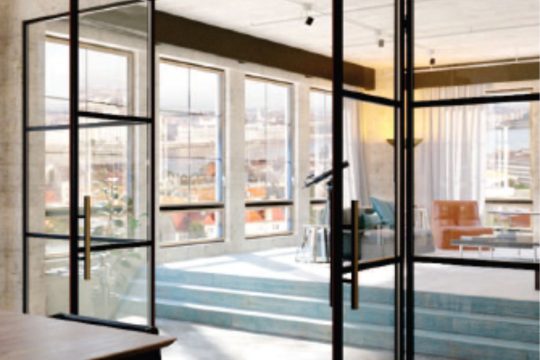 Az Arts 50 üvegezett pántos nyílóajtó- és válasz- falrendszer nagyon elegáns és minimalista, akárcsak a francia acél ajtók és keretek.