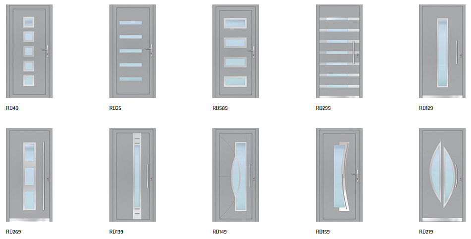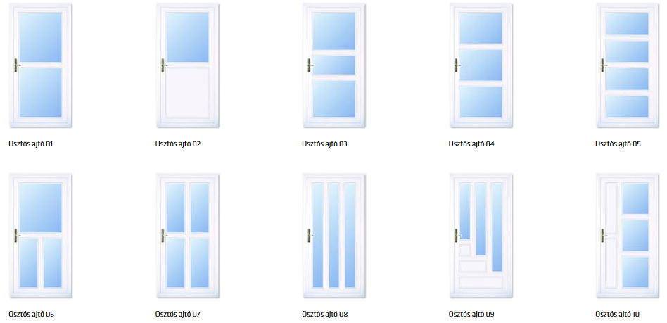 Ezen bejárati ajtó típust azon érdeklődőknek ajánljuk, akik a nagy üvegfelületeket ill. az egyedi megjelenést részesítik előnyben. A szárnyosztók különböző elhelyezésével, egyedi ötletek is megvalósíthatók. Az osztók által behatárolt területekbe különböző hőszigetelt üvegtípusokat (float, katedrál, savmart, reflexiós, stb.) és hőszigetelt tömör betéteket tudunk elhelyezni. Az üveg és betét vastagság növelésével, a hőszigetelési érték javítható. A fehér szín mellett, faerezet mintás és struktúrált fóliával ellátott kivitelek is rendelhetők.